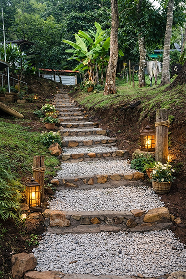 Encantador sendero rústico de piedra rodeado de naturaleza y vegetación tropical.