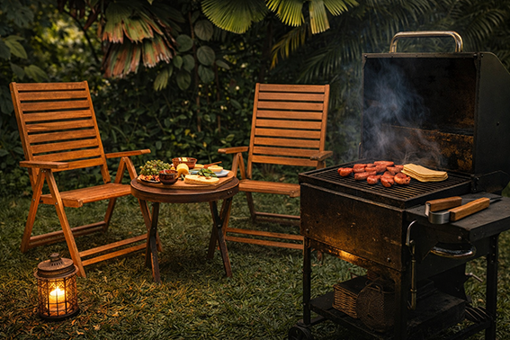 Acogedora área de parrilla rodeada de naturaleza, ideal para disfrutar comidas al aire libre, compartir con amigos y vivir momentos inolvidables en un ambiente rústico.
